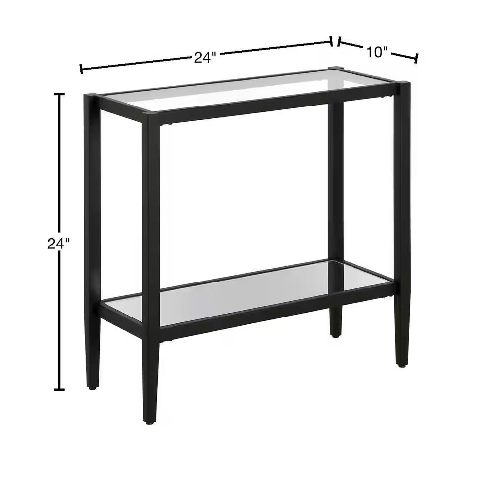 This contemporary side table is the perfect pick for your living room or den ensemble. The tabletop features transparent tempered glass perfect for placing a table lamp, remotes, or your favorite books. The lower mirrored glass shelf plays off the tempered glass top and is perfect for showcasing decor.tive items. Its understated silhouette and neutral metallic finish allow it to blend in with your existing decor.style. or color scheme.. Assembly Required: Assembly Required. Color Family: Black. Color/Finish: Blackened Bronze. Features: No Additional Features. Finish Family: Other. Frame Material: Metal. Interior Furniture Type: End Table. Number of Pieces: 1. Package Type: Individual. Product Weight (lb.): 16.5 lb. Remote Access: No Remote Access. Requires Hub?: No Hub Required. Returnable: 30-Day. Room Type: Living Room. Shape: Rectangle. Top Material: Glass. Type: Other. Weight Capacity (lb.): 20 lb. Works With: No additional compatibility. Product Depth (in.): 10 in. Product Height (in.): 24 in. Product Width (in.): 24 in. Top Material: Glass. Shape: Rectangle. Finish Family: Other. Number of Pieces: 1. Frame Material: Metal. Assembly Required: Assembly Required