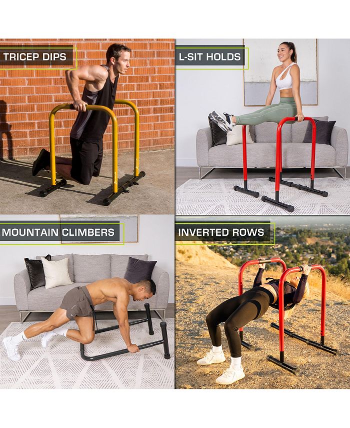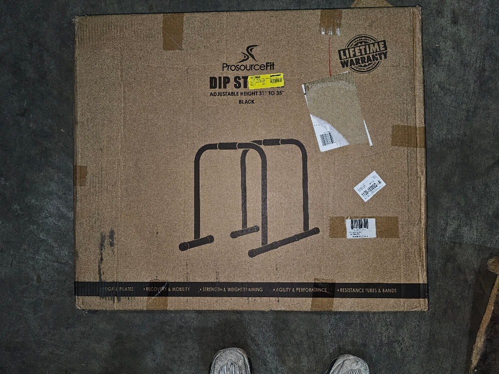 The ProsourceFit Dip Station is a convenient, multifunctional set of parallel workout bars that are perfect for upper body and core workouts to perform exercises like tricep dips, L-sits, push-ups, inverted rows and more. Adjust bar from 31” to 35” in height and from 16 .25” to 23 .25” between bars. SAFE and STABLE-: Rubber feet help to prevent slipping, and a stabilizing safety connector extends length between bars from 19 .5” to 26 .5” inches.. UPPER BODY BODYWEIGHT TRAINING- Padded grips make it comfortable to build muscle without weights by performing dips, L-sits, push-ups, inverted rows. ADJUSTABLE-: Each bar is 19.5 ” to 26.5” inches with 1 ” increments and 7 adjustable levels, so you can set them parallel or staggered for more exercise variety. DURABLE DESIGN- Powder coated, sturdy iron tubes can support up to 400 lbs., so you can safely train chest, triceps, shoulders and core. LIGHTWEIGHT and PORTABLE- Iron bars are lightweight and easy to move around and take apart for transporting wherever you want to workout. Iron Tube, Rubber. Imported