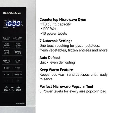 Panasonic 1.3 cu ft Countertop Microwave Oven in Glass Door The Panasonic NN-SB65NSD microwave features a streamlined, numberless control panel with auto reheat and defrost functions Delay start timer and 10 power levels provide flexibility for various cooking needs Compact design maximizes limited countertop space while offering a spacious 1.3 cubic foot interior High power of 1100 Watts ensures faster cooking times while preserving natural nutrients in food Includes seven auto-cook menu options for convenient meal preparation Dedicated popcorn button for quick and easy snack preparation