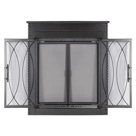 Glass doors reduce cool air and heat loss up the chimney by as much as 90% when fire is not lit Cabinet-style doors close with easy-catch magnets to provide energy efficiency Rigid mesh fireplace screen panels Hidden damper knob to control air flow Easy grip handles