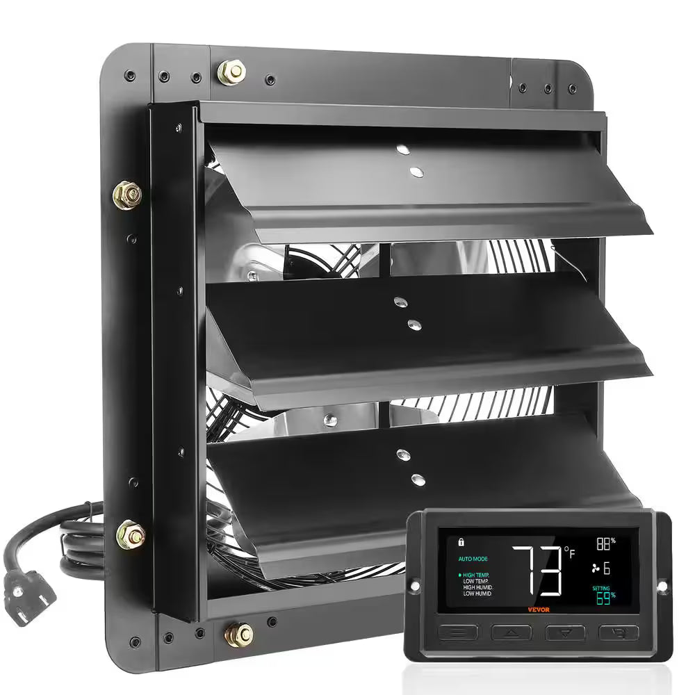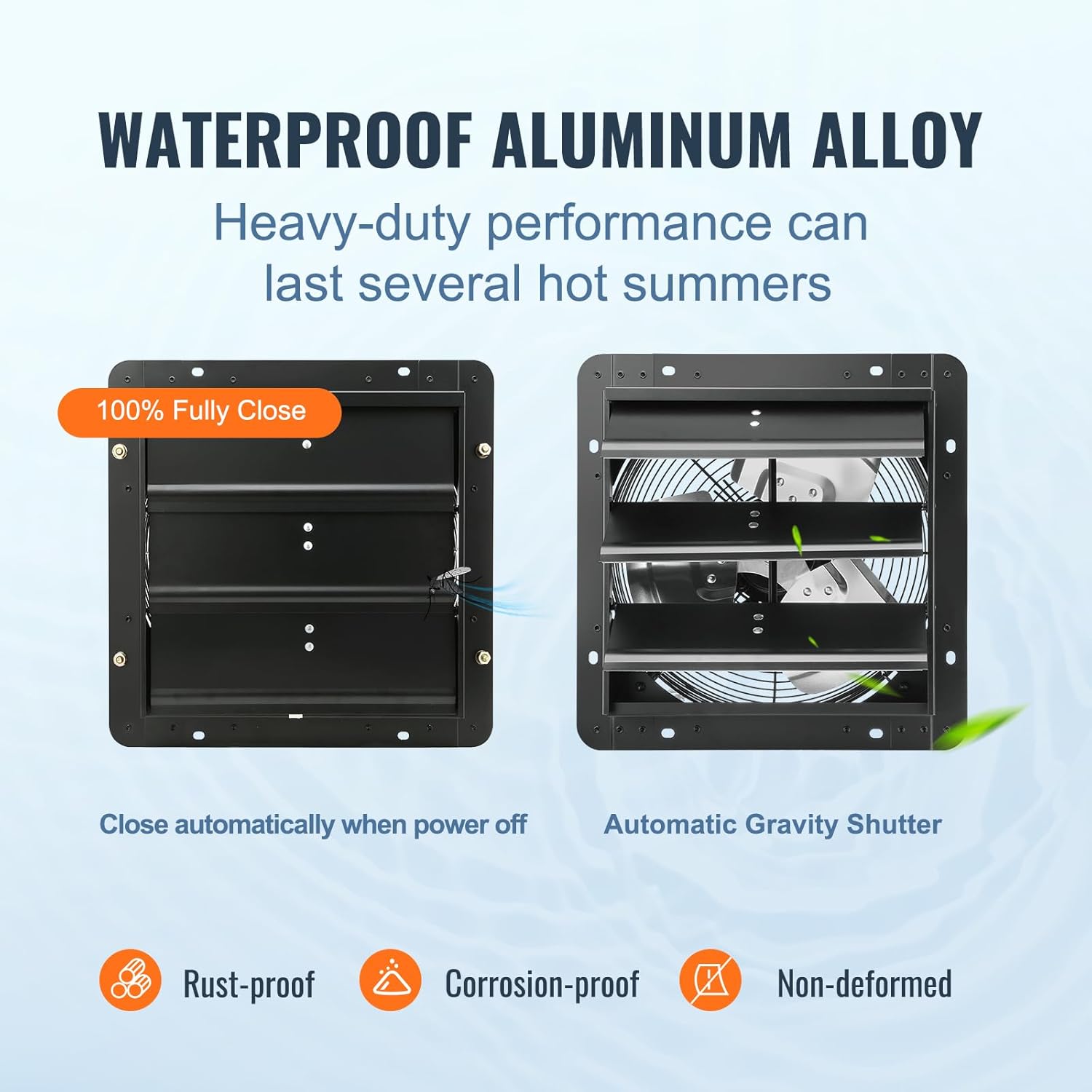 What's the best way to beat the heat? Our Exhaust Fans are the quickest and most effective solution. Summer heat, humidity, and odors are dissipated with a single fan. When not running in winter, the shutter will close automatically, keeping your house warm and your fan secure from rain. Equipped with an EC motor and intelligent controller, the worry-free control with low energy consumption can comfort you all summer long! Start creating a healthy, secure home environment today with VEVOR!. Color Family: Black. Color/Finish: Black. Power Type: Electric Powered. Product Weight (lb.): 10.6 lb. Returnable: 90-Day. Product Depth (in.): 6.1 in. Product Height (in.): 15 in. Product Width (in.): 15 in. Power Type: Electric Powered