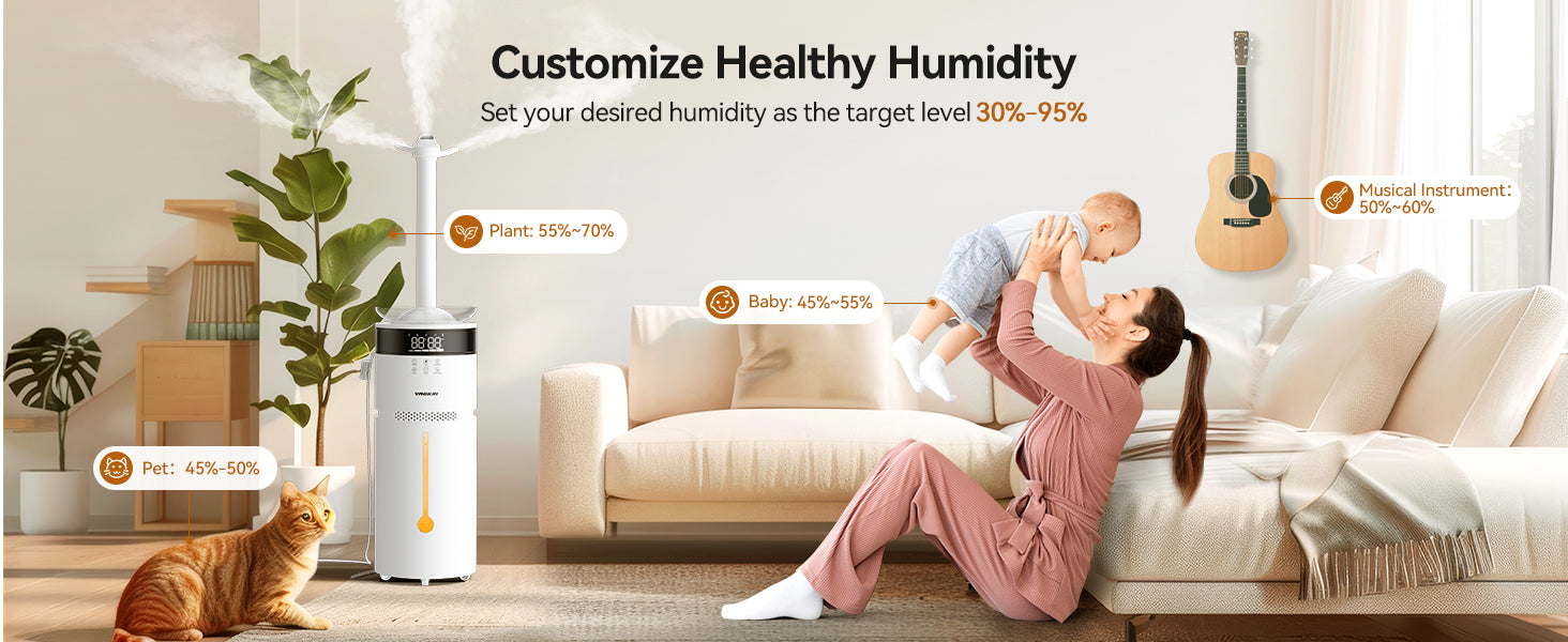 - Intelligent Humidity Control: Featuring a one-touch automatic mode and an upgraded humidity regulator, this humidifier helps monitor real-time humidity levels, allowing for customized humidity ranging from 45% to 70%. The humidity regulator function automatically adjusts humidity levels for a safe and comfortable environment.