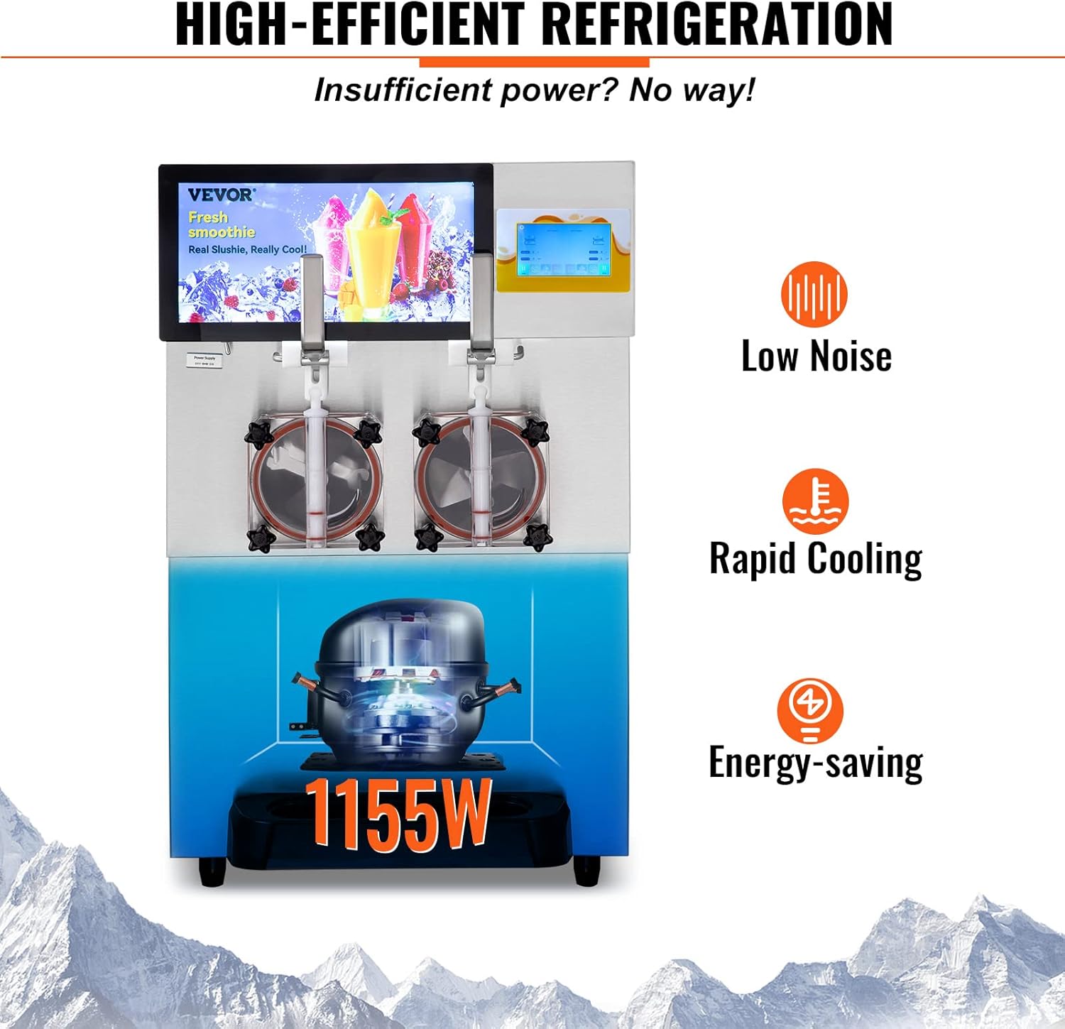 1155W Powerful Compressor: Our refrigeration system has excellent features for fast cooling and efficient slush production, specially designed for the business of summer frozen drinks. The 1155W powerful compressor has fast cooling capabilities that are energy saving while maintaining a quiet operation.