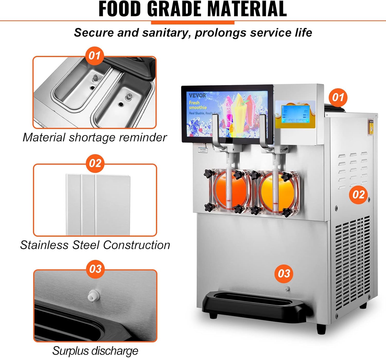 Food Grade 304 Stainless Steel: Get ready for a slushy machine that knows what you want. The entire slushy machine is made of high quality food grade 304 stainless steel, which has excellent corrosion and rust resistance, withstand high pressure and is easy to clean. There is a sign in the cylinder to remind you to replenish the raw material in time; there is a small hole in the body for discharging the remaining ingredients to avoid clogging.