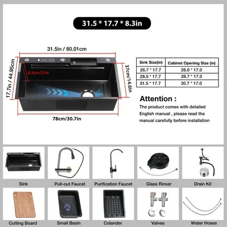 MULTIFUNCTIONAL SINK: This rotatable rainfall waterfall pull out faucet kitchen sink provides versatility and functionality for any kitchen needs. Offering a more convenient and efficient washing experience. ??️ LARGE CAPACITY: This kitchen sink is functional and large enough. which is enough to wash your pots, pans, and cups to meet the needs of a multi-family home, making it an ideal utility sink for families. Equipped with a large basin, it provides ample space for washing, soaking and rinsing dishes while making your daily chores more efficient. Perfect for large families or commercial use. ??️ NANO STAINLESS STEEL KITCHEN SINKS: This black sink kitchen is made of excellent 304 stainless steel, corrosion and rust resistant and dent resistant, and the surface plus nano-coating prevents scratches, grease can be easily washed and inhibits bacterial growth, giving you a wonderful quality of life experience. ??️ MULTIPLE MODES: The 360° pull-out faucet has three modes, running water mode for daily cleaning, spray mode for rinsing; and dual water knives for rinsing large stubborn stains. The innovative waterfall sink is soft and even, making it easier to clean fruits, vegetables, and meat. ??️ DOUBLE SLIDING RAILS: The inner wall of this undermount kitchen sink has double rails, which can be placed on the sink accessories to slide at will and efficiently utilize the workspace, our accessories solid wood cutting board, nano pot-in-pot, and triangular draining baskets can be placed on the sliding rails to form different work areas. ??️ QUIET SINK: The single bowl kitchen sink thickened acoustic coating noise reduction can greatly reduce the noise generated by the impact of water flow in the sink, the anti-condensation coating can prevent water from accumulating at the bottom of the sink to keep the cabinets dry, and the sewer is sealed design, will not be discharged from the sewer holes in the odor. ??️ DRAINAGE DESIGN: The U-shaped water guide is designed to drain quickly without leaving any residue, which greatly reduces the time and effort required to clean the sink. The sink is equipped with a countertop drain switch that automatically drains quickly with a twist, eliminating the need to manually open the drain cover and avoiding grease stains sticking to your hands. ??️ STYLISH AND PRACTICAL DESIGN: Its stylish and modern design adds a contemporary touch to your kitchen, combining both aesthetics and practicality. Not only functional but also adds a chic accessory to your kitchen decor.